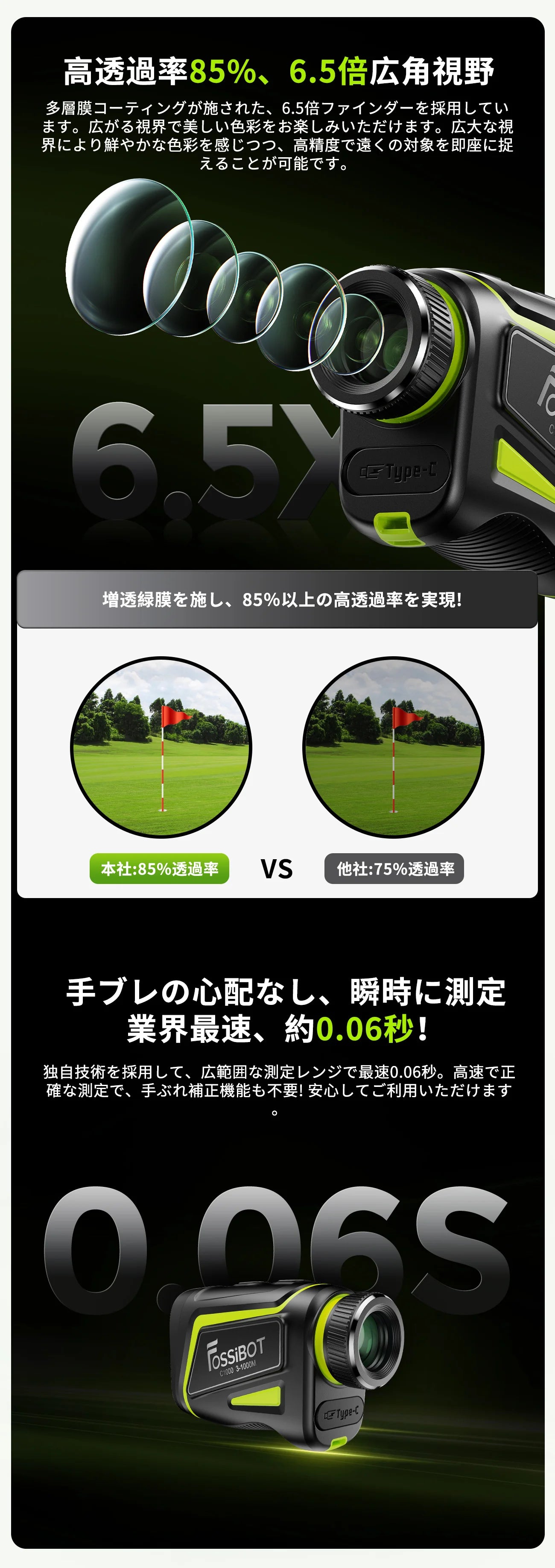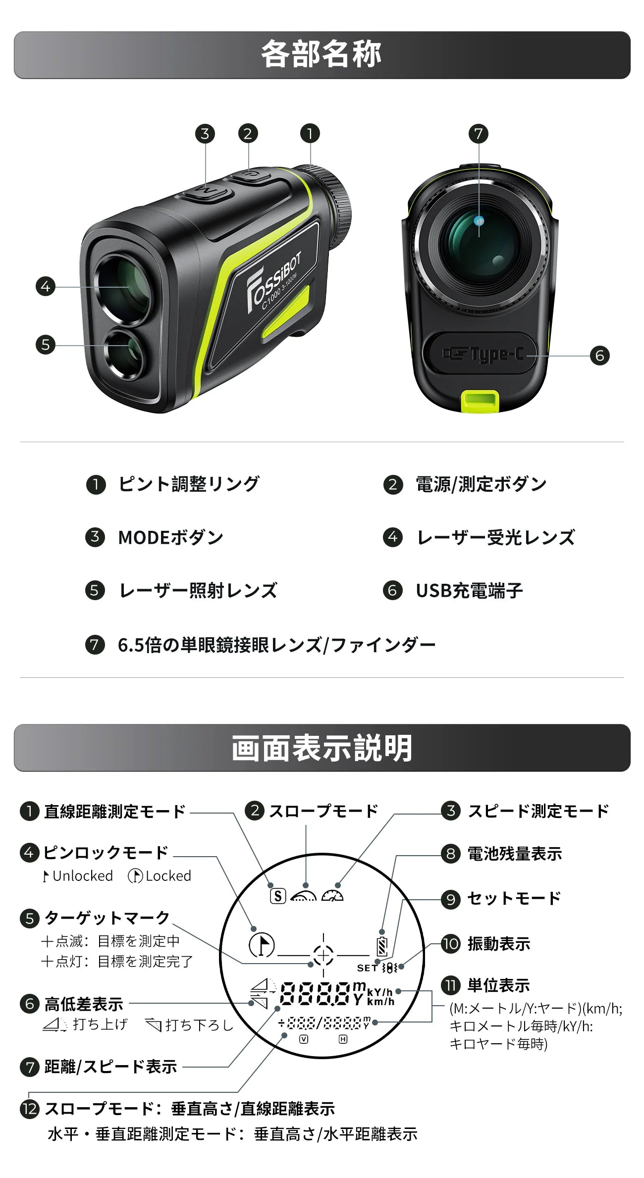 FOSSiBOTゴルフレーザー距離計は競技でも使用できますか?FOSSiBOTゴルフレーザー距離計は、スロープ補正(高低差表示)などの一部機能が搭載されており、日本ゴルフ協会(JGA)やR&Aの競技規則に基づく正式なトーナメントではご使用いただけない場合があります。現時点では、本製品は競技用途を対象とした認証を受けておらず、公式競技での使用は非推奨です。ただし、プライベートラウンドや練習ラウンド、親しい仲間とのコンペなど、カジュアルなシーンでは非常に有効にご活用いただけます。