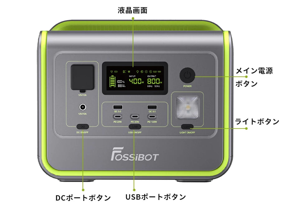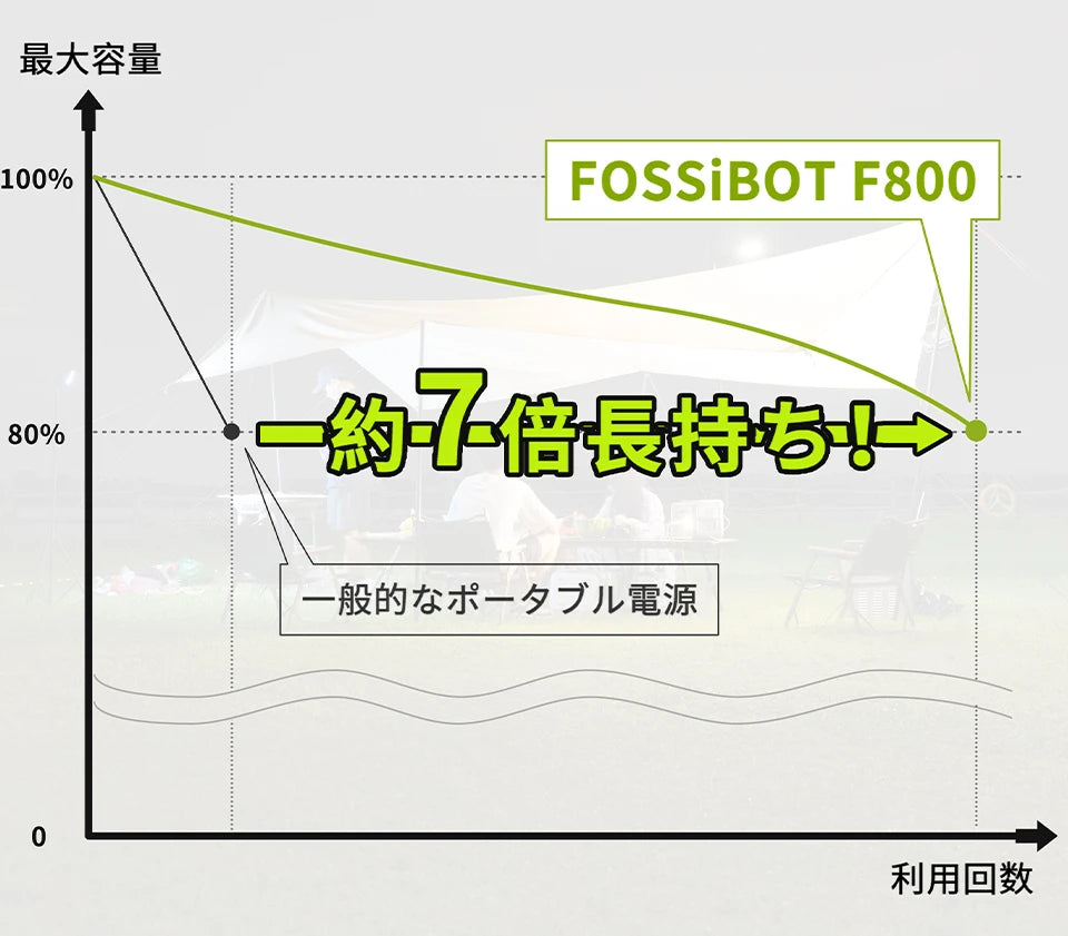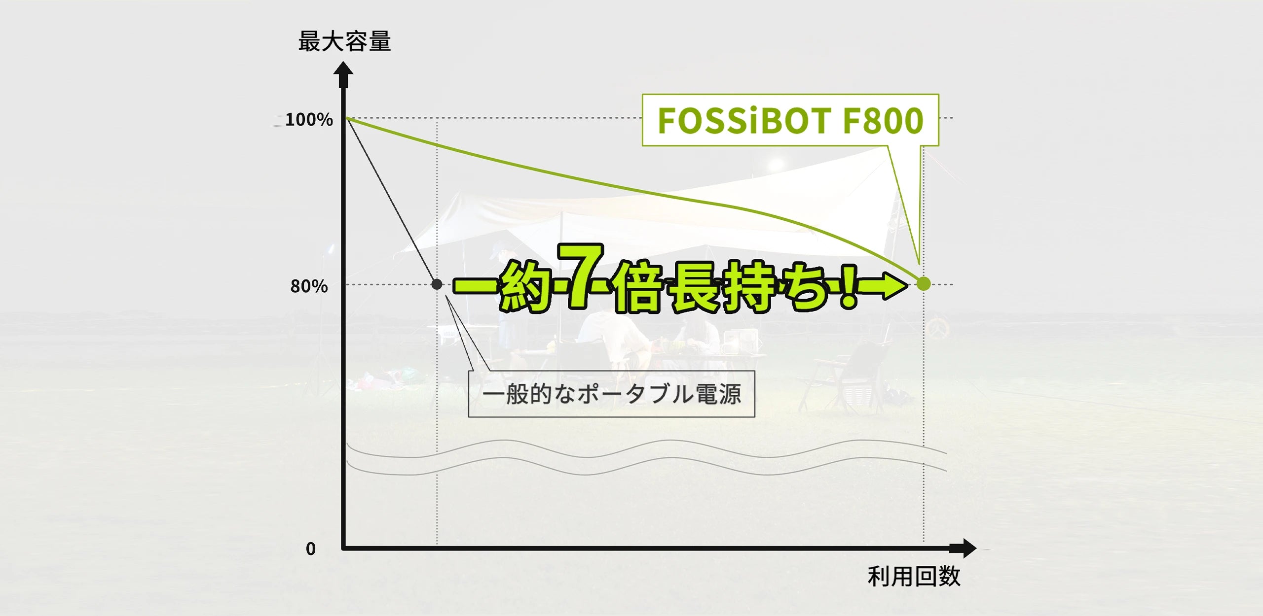 FOSSiBOTポータブル電源F800は、高品質なリン酸鉄リチウムイオンバッテリーを搭載しており、フル充電して保管していてもバッテリーの劣化がしにくく、充電済みの状態で保存できる特長があります。満充電の状態で保存できるため、災害の備えとして安心できます。