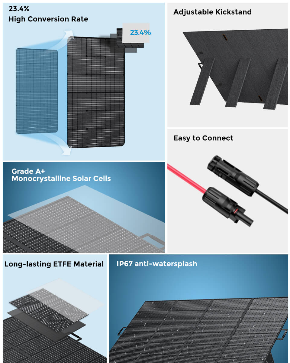 SP420ソーラーパネルは効率的な単結晶セルパネルで作られて、結晶が規則正しく並んでいるため電力ロスが少なくて優れた性能が備えます。太陽光の転換率は23.4%に達成し、数枚を組み合わせて直列充電もできます。